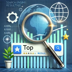 DALL·E 2024-10-02 10.45.31 – An image representing high search engine rankings, featuring a search engine results page (SERP) with a highlighted top result. The image includes a m